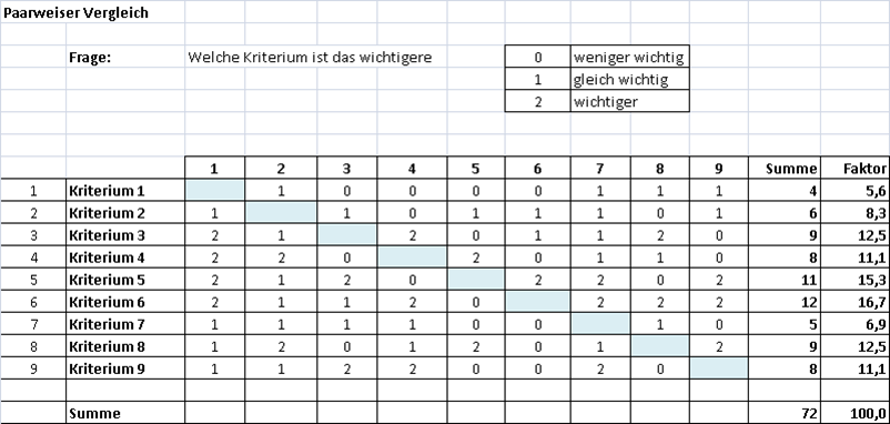 Bei einem Paarvergleich werden alle Kriterien untereinander hinsichtlich ihrer je weiligen Vorrangigkeit bewertet und daraus ihre Vorzugshäufigkeit abgeleitet Aus den Verzugshäufigkeiten resultiert dann die Kriteriengewichtung.
