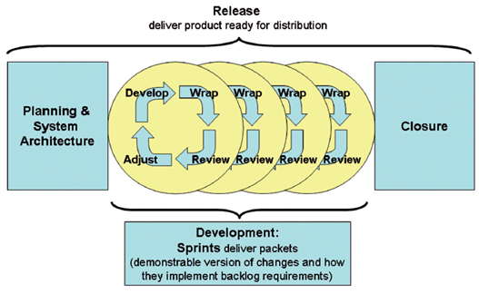 Das Scrum-Vorgehensmodell kennt ursprünglich explizit drei Rollen mit jeweils verschiedenen Verantwortungen: Product Owner, Entwicklungsteam und Scrum Master sowie drei Zeremonien: Sprint Planning, Sprint Review undDaily Scrum, und drei Artefakte: Product Backlog, Sprint Backlog und Burndown Chart.